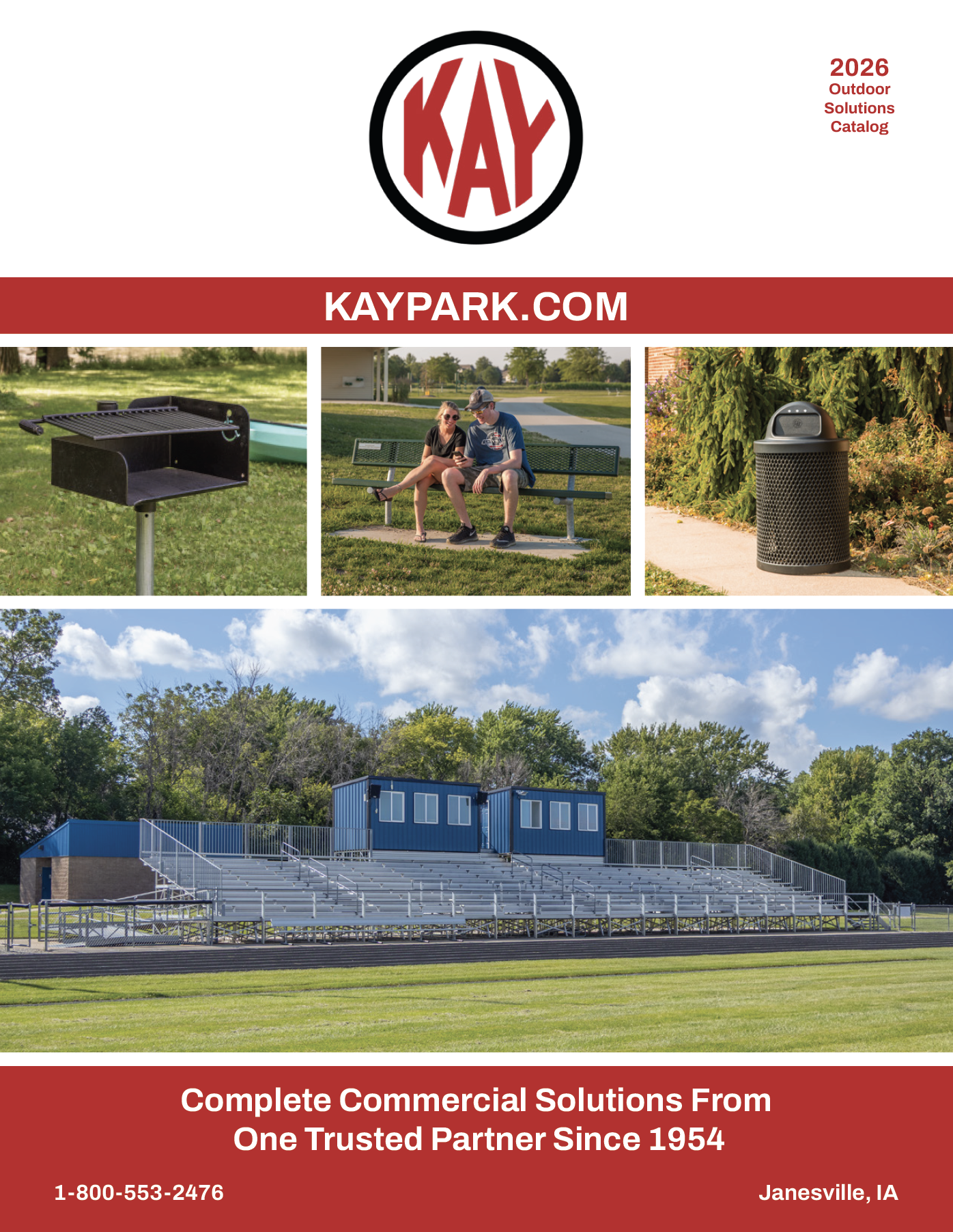 Welcome to Kay Park’s on-line catalog available to you 24-hours a day. Use the form below to select the product categories you would like to receive information on. We offer a large selection of park and playground equipment and commercial grade site furnishings, including outdoor tables, grills, benches, trash containers, drinking fountains, planters, umbrellas, bollards, shade canopies and bike racks. We have a complete line of bleachers and grandstands, as well as some outdoor athletic equipment, play systems and a rental-duty fiberglass pedal boat. Please browse through our selection and feel free to contact us if you have any questions.