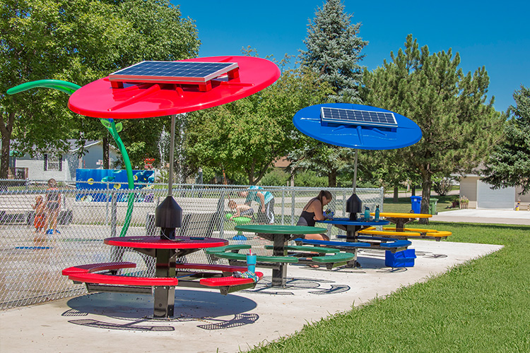 Kay Park’s Solar charging systems can be mounted on our fiberglass umbrella structures or steel ring panels to create a comfortable seating area that also provides charging capabilities directly at the table. This is especially valuable in locations where guests may spend several hours at a time, such as waterparks, amusement parks, resorts, or large recreation facilities.
